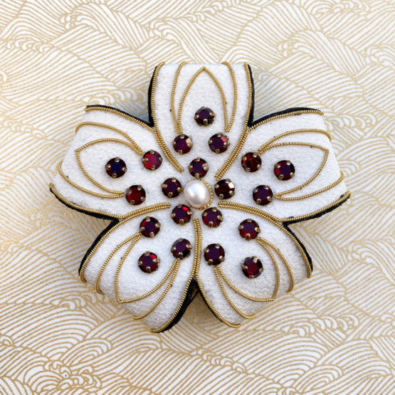Matériaux utilisés : fils de soie, de coton et d’or / Chirimen blanc